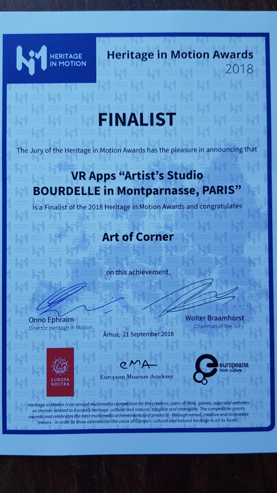 Le 21 septembre, a eu lieu l’événement Heritage in Motion (HIM) 2018, au Danemark, à Aarhus. HIM est un concours multimédia pour les créateurs et les utilisateurs de films, jeux, applications et sites Web sur des thèmes liés au patrimoine européen, culturel et naturel, matériel et immatériel.